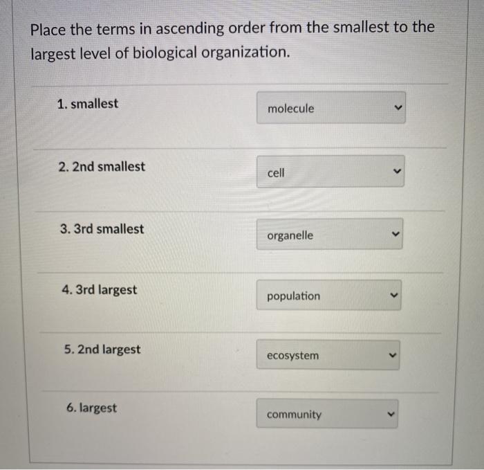 Molecule cell tissue organ organ system organism population community ecosystem biosphere. Cells can be prokaryotic without nucleus or eukaroyotic with nucleus. The levels from smallest to largest are.